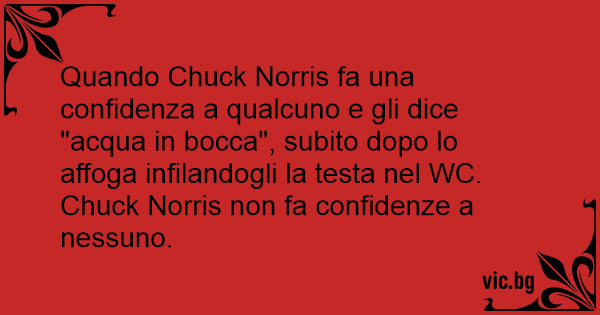 Quando Chuck Norris fa una confidenza a qualcuno e gli dice "acqua in bocca", subito dopo lo affoga infilandogli la testa nel WC. Chuck Norris non fa confidenze a nessuno.