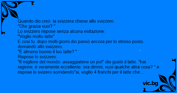 "Il migliore del mondo. assaggiatene un po!" dio gustò il latte. "hai ragione, è veramente eccellente. ora dimmi, vuoi qualche altra cosa? " e rispose lo svizero sorridendo"si, voglio 4 franchi per il latte che avete bevuto!"