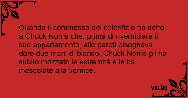 Quando il commesso del colorificio ha detto a Chuck Norris che, prima di riverniciare il suo appartamento, alle pareti bisognava dare due mani di bianco, Chuck Norris gli ha subito mozzato le estremità e le ha mescolate alla vernice.