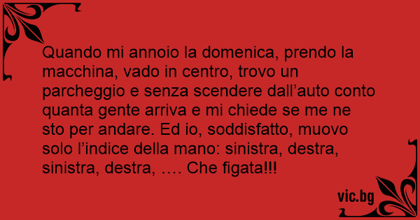 Quando mi annoio la domenica, prendo la macchina, vado in centro, trovo un parcheggio e senza scendere dall’auto conto quanta gente arriva e mi chiede se me ne sto per andare. Ed io, soddisfatto, muovo solo l’indice della mano: sinistra, destra, sinistra, destra, …. Che figата!!!