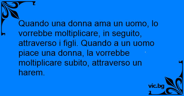 Quando una donna ama un uomo, lo vorrebbe moltiplicare, in seguito, attraverso i figli. Quando a un uomo piace una donna, la vorrebbe moltiplicare subito, attraverso un harem.