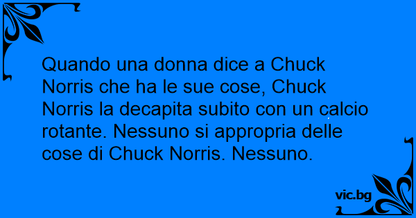 Quando una donna dice a Chuck Norris che ha le sue cose, Chuck Norris la decapita subito соn un calcio rotante. Nessuno si appropria delle cose di Chuck Norris. Nessuno.