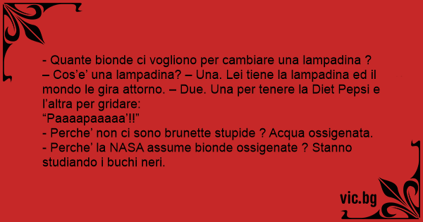 - Quante bionde ci vogliono per cambiare una lampadina ? – Cos’e’ una lampadina? – Una. Lei tiene la lampadina ed il mondo le gira attorno. – Due. Una per tenere la Diet Pepsi e l’altra per gridare:
