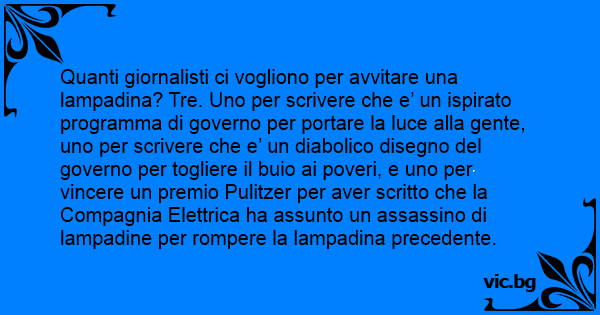 Quanti giornalisti ci vogliono per avvitare una lampadina? Tre. Uno per scrivere che e’ un ispirato programma di governo per portare la luce alla gente, uno per scrivere che e’ un diabolico disegno del governo per togliere il buio ai poveri, e uno per vincere un premio Pulitzer per aver scritto che la Compagnia Elettrica ha assunto un assassino di lampadine per rompere la lampadina precedente.