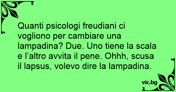 Quanti psicologi freudiani ci vogliono per cambiare una lampadina? Due. Uno tiene la scala e l’altro avvita il pene. Ohhh, scusa il lapsus, volevo dire la lampadina.