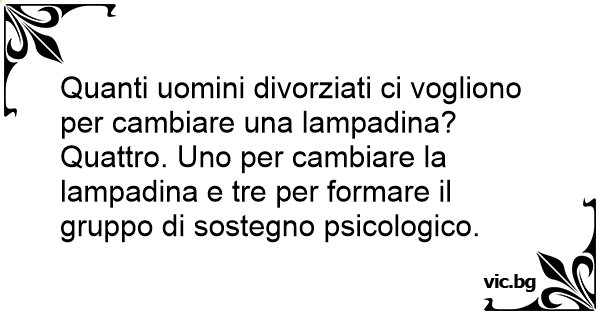Quanti uomini divorziati ci vogliono per cambiare una lampadina? Quattro. Uno per cambiare la lampadina e tre per formare il gruppo di sostegno psicologico.