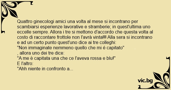 Quattro ginecologi amici una volta al mese si incontrano per scambiarsi esperienze lavorative e stramberie; in quest'ultima uno eccelle sempre. Allora i tre si mettono d'accordo che questa volta al costo di raccontare frottole non l'avrà vinta!!! Alla sera si incontrano e ad un certo punto quest'uno dice ai tre colleghi: