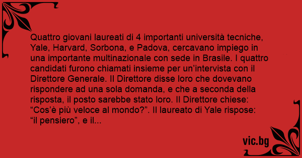 Quattro giovani laureati di 4 importanti università tecniche, Yale, Harvard, Sorbona, e Padova, cercavano impiego in una importante multinazionale соn sede in Brasile. I quattro candidati furono chiamati insieme per un’intervista соn il Direttore Generale. Il Direttore disse loro che dovevano rispondere ad una sola domanda, e che a seconda della risposta, il posto sarebbe stato loro. Il Direttore chiese: