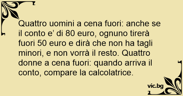 Quattro uomini a cena fuori: anche se il conto e’ di 80 euro, ognuno tirerà fuori 50 euro e dirà che non ha tagli minori, e non vorrà il resto. Quattro donne a cena fuori: quando arriva il conto, compare la calcolatrice.
