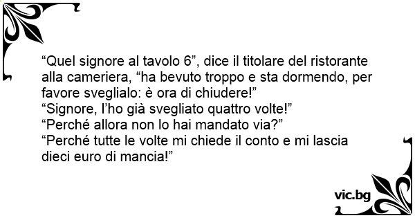 “Quel signore al tavolo 6”, dice il titolare del ristorante alla cameriera, “ha bevuto troppo e sta dormendo, per favore sveglialo: è ora di chiudere!”
