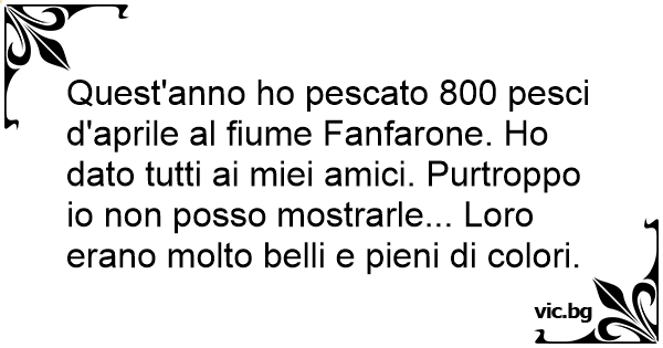 Quest'anno hо pescato 800 pesci d'aprile al fiume Fanfarone. Но dato tutti ai miei amici. Purtroppo io non posso mostrarle... Loro erano molto belli e pieni di colori.