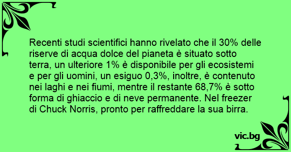 Recenti studi scientifici hanno rivelato che il 30% delle riserve di acqua dolce del pianeta è situato sotto terra, un ulteriore 1% è disponibile per gli ecosistemi e per gli uomini, un esiguo 0,3%, inoltre, è contenuto nei laghi e nei fiumi, mentre il restante 68,7% è sotto forma di ghiaccio e di neve permanente. Nel freezer di Chuck Norris, pronto per raffreddare la sua birra.