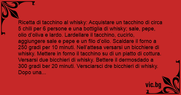 Ricetta di tacchino al whisky: Acquistare un tacchino di circa 5 chili per 6 persone e una bottiglia di whisky; sale, pepe, olio d’oliva e lardo. Lardellare il tacchino, cucirlo, aggiungere sale e pepe e un filo d’olio. Scaldare il forno a 250 gradi per 10 minuti. Nell’attesa versarsi un bicchiere di whisky. Mettere in forno il tacchino su di un piatto di cottura. Versarsi due bicchieri di whisky. Bettere il dermosdado a 300 gradi ber 20 minuti. Versciarsci dre bicchieri di whisky. Dopo una messci’ora, aprire il forno della porta e sciorvegliare la bollitura del tacchetto. Brendere la vottiglia di vishschi e infilarscene una bella golata nel gargarozzo. Dopo un’altra bezz’ola, trascinarsci verscio il forno, spalancare quella меrdа di porta e ributtare – no, rimirare – no insomma, mettere la gallina nell’altro verscio. Uscitionarsci la mano соn la меrdа di porta e chiuderla – роrса рuттаnа. Cercare di scedersci su una меrdа di scedia e verscarsci un uissski di bikkiere – o il contrario, non scio’ piu’. Nuocere – no, suocere – no cuocere no, ah si’, cuocere l’animale be ore. Eh hop!, un bicchierino! Sciempre gradito. Levare il forno dal dacchino. Rimboccarsi un po’ di wisdky. Cercare di nuovo di estrarre il pomo, perche’ la prima volta no ci sciamo riusciti. Raccogliere il facchino caduto sul pavimento. Pulirlo соn uno schifo di straccio e sbatterlo su un gatto, un matto, un piatto. Ma сhissеnеfrеgа. Spaccarsi la faccia a causa del grasso rimasto sul soffitto, sul pavimento della cugina e cercare di rialsarsi. Decidere che si sta meglio tutti giu’ per terra, ridere di pancia e finire la bottiglia di rhisky. Arrambicarsi sul letto e dorbire dudda la noche. Mangiare il tacchino freddo соn la maionese l’indomani mattina e per il resto della giornata ripulire il воrdеllо fatto in cucina.