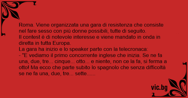 - "E vediamo il primo concorrente inglese che inizia. Se ne fa una, due, tre... cinque... otto... e niente, non ce la fa, si ferma a otto! Ma ecco che parte subito lo spagnolo che senza difficoltà se ne fa una, due, tre... sette... dodici... quindici... e abbandona, anche lui non riesce a proseguire. Diamo subito il via al concorrente italiano, il più atteso in questa incredibile gara di resistenza. Eccolo che inizia! Una... sei... diciotto... trentasette... cinquantaquattro... il pubblico è in delirio... settantanove... novantadue... centodiciannove... primo cameraman... secondo cameraman... assistente di studio... regista... ahhhh!"