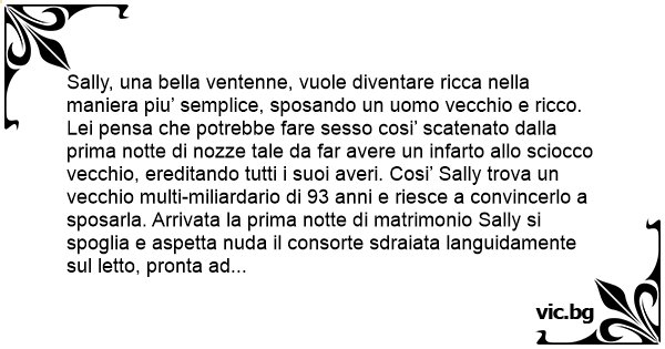 Sally, una bella ventenne, vuole diventare ricca nella maniera piu’ semplice, sposando un uomo vecchio e ricco. Lei pensa che potrebbe fare sesso cosi’ scatenato dalla prima notte di nozze tale da far avere un infarto allo sciocco vecchio, ereditando tutti i suoi averi. Cosi’ Sally trova un vecchio multi-miliardario di 93 anni e riesce a convincerlo a sposarla. Arrivata la prima notte di matrimonio Sally si spoglia e aspetta nuda il consorte sdraiata languidamente sul letto, pronta ad eccitare il nuovo marito non appena esce dal bagno. Lo sposo esce dal bagno соn indosso solo tappi alle orecchie, un fermaglio al naso, ed il preservativo. Sally domanda “Posso capire il preservativo, ma perche’ hai tappi per le orecchie e fermaglio per il naso?”. Il marito di Sally risponde: