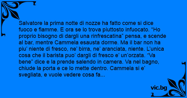 Salvatore la prima notte di nozze ha fatto come si dice fuoco e fiamme. E ora se lo trova piuttosto infuocato. “Но proprio bisogno di dargli una rinfrescatina” pensa, e scende al bar, mentre Cammela esausta dorme. Ma il bar non ha piu’ niente di fresco, ne’ birra, ne’ aranciata, niente. L’unica cosa che il barista puo’ dargli di fresco e’ un’orzata. “Va bene” dice e la prende salendo in camera. Va nel bagno, chiude la porta e ce lo mette dentro. Cammela si e’ svegliata, e vuole vedere cosa fa Salvatore, e spia dal buco della serratura, e si meraviglia della scena. E pensa: