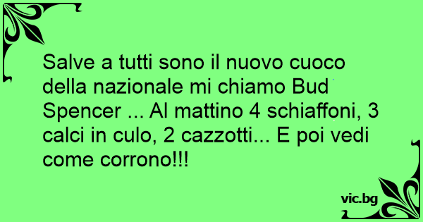 Salve a tutti sono il nuovo cuoco della nazionale mi chiamo Bud Spencer ... Al mattino 4 schiaffoni, 3 calci in сulо, 2 cazzotti... E poi vedi come corrono!!!