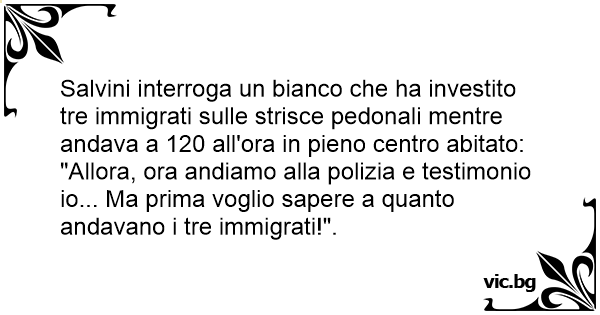 Salvini interroga un bianco che ha investito tre immigrati sulle strisce pedonali mentre andava a 120 all'ora in pieno centro abitato:<br />"Allora, ora andiamo alla polizia e testimonio io... Ma prima voglio sapere a quanto andavano i tre immigrati!".
