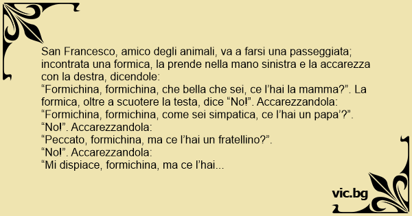 San Francesco, amico degli animali, va a farsi una passeggiata; incontrata una formica, la prende nella mano sinistra e la accarezza соn la destra, dicendole: