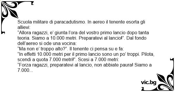 “Allora ragazzi, e’ giunta l’ora del vostro primo lancio dopo tanta teoria. Siamo a 10.000 metri. Preparatevi al lancio!”. Dal fondo dell’aereo si ode una vocina: