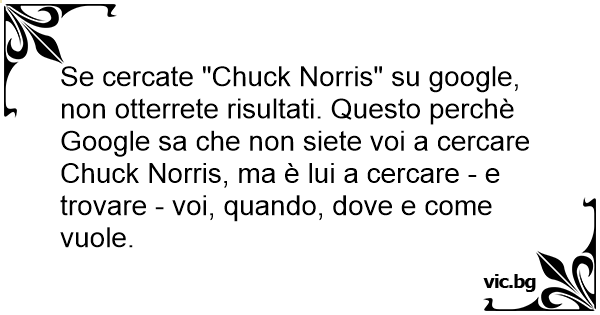 Se cercate "Chuck Norris" su google, non otterrete risultati. Questo perchè Google sa che non siete voi a cercare Chuck Norris, ma è lui a cercare - e trovare - voi, quando, dove e come vuole.