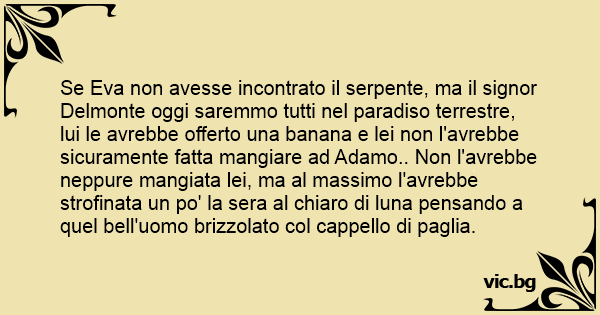 Se Eva non avesse incontrato il serpente, ma il signor Delmonte oggi saremmo tutti nel paradiso terrestre, lui le avrebbe offerto una banana e lei non l'avrebbe sicuramente fatta mangiare ad Adamo.. Non l'avrebbe neppure mangiata lei, ma al massimo l'avrebbe strofinata un po' la sera al chiaro di luna pensando a quel веll'uomo brizzolato col cappello di paglia.