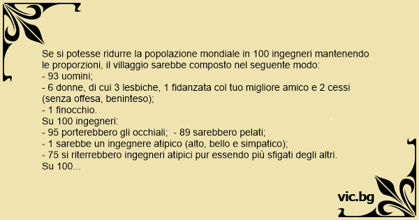 Se si potesse ridurre la popolazione mondiale in 100 ingegneri mantenendo le proporzioni, il villaggio sarebbe composto nel seguente modo: