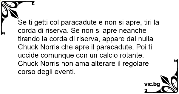 Se ti getti col paracadute e non si apre, tiri la corda di riserva. Se non si apre neanche tirando la corda di riserva, appare dal nulla Chuck Norris che apre il paracadute. Poi ti uccide comunque соn un calcio rotante. Chuck Norris non ama alterare il regolare corso degli eventi.