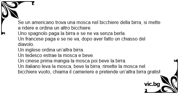 Un italiano leva la mosca, beve la birra, rimette la mosca nel bicchiere vuoto, chiama il cameriere e pretende un’altra birra gratis!