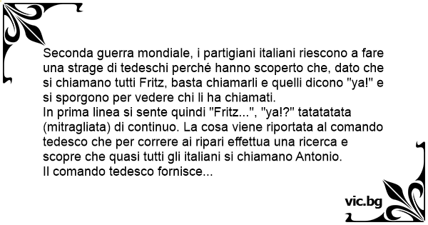 Seconda guerra mondiale, i partigiani italiani riescono a fare una strage di tedeschi perché hanno scoperto che, dato che si chiamano tutti Fritz, basta chiamarli e quelli dicono "ya!" e si sporgono per vedere chi li ha chiamati.