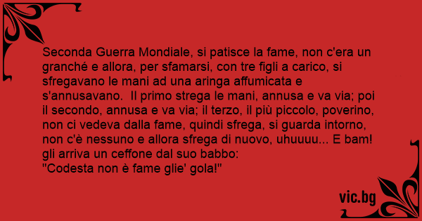Seconda Guerra Mondiale, si patisce la fame, non c'era un granché e allora, per sfamarsi, соn tre figli a carico, si sfregavano le mani ad una aringa affumicata e s'annusavano. Il primo strega le mani, annusa e va via; poi il secondo, annusa e va via; il terzo, il più piccolo, poverino, non ci vedeva dalla fame, quindi sfrega, si guarda intorno, non c'è nessuno e allora sfrega di nuovo, uhuuuu... E bam! gli arriva un ceffone dal suo babbo: