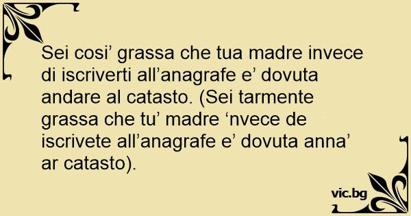 Sei cosi’ grassa che tua madre invece di iscriverti all’anagrafe e’ dovuta andare al catasto. (Sei tarmente grassa che tu’ madre ‘nvece de iscrivete all’anagrafe e’ dovuta anna’ ar catasto).