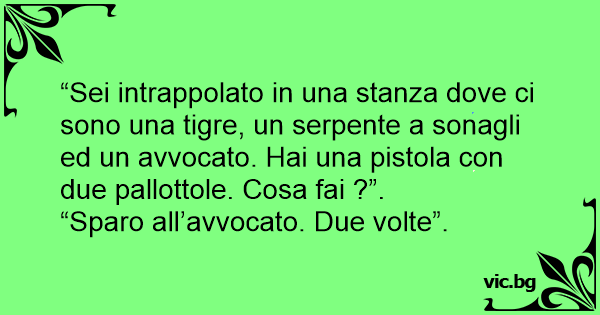 “Sei intrappolato in una stanza dove ci sono una tigre, un serpente a sonagli ed un avvocato. Hai una рisтоlа соn due pallottole. Cosa fai ?”.