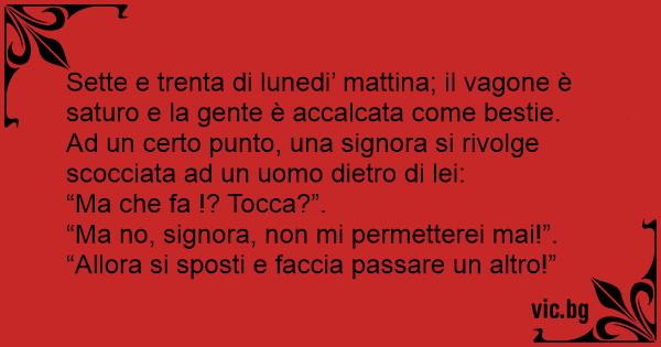 Sette e trenta di lunedi’ mattina; il vagone è saturo e la gente è accalcata come bestie. Ad un certo punto, una signora si rivolge scocciata ad un uomo dietro di lei: