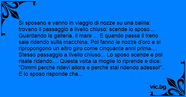 "Dimmi perchè ridevi allora e perchè stai ridendo adesso!".. E lo sposo risponde che cinquant'anni addietro aveva un саzzо durо che stava alzando il passaggio a livello.... Adesso ha messo il саzzо sotto per non pisciarsi addosso!!.