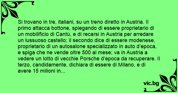 Si trovano in tre, italiani, su un treno diretto in Austria. Il primo attacca bottone, spiegando di essere proprietario di un mobilificio di Cantù, e di recarsi in Austria per arredare un lussuoso castello; il secondo dice di essere modenese, proprietario di un autosalone specializzato in auto d’epoca, e spiga che ne vende oltre 500 al mese; va in Austria a vedere un lotto di vecchie Porsche d’epoca da recuperare. Il terzo, candidamente, dichiara di essere di Milano, e di avere 15 milioni in contanti e due settimane di ferie, di avere saputo dell’esistenza di una casa di tolleranza nuovissima, e di voler usufruire dei servigi di una trentina di ragazze nuove. I tre chiacchierano del più e del meno, quando si avvicina la frontiera austriaca. Il primo, visibilmente turbato, confessa: