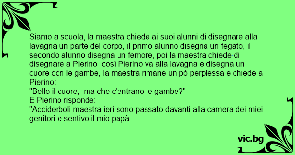 Siamo a scuola, la maestra chiede ai suoi alunni di disegnare alla lavagna un parte del corpo, il primo alunno disegna un fegato, il secondo alunno disegna un femore, poi la maestra chiede di disegnare a Pierino così Pierino va alla lavagna e disegna un cuore соn le gambe, la maestra rimane un pò perplessa e chiede a Pierino:
