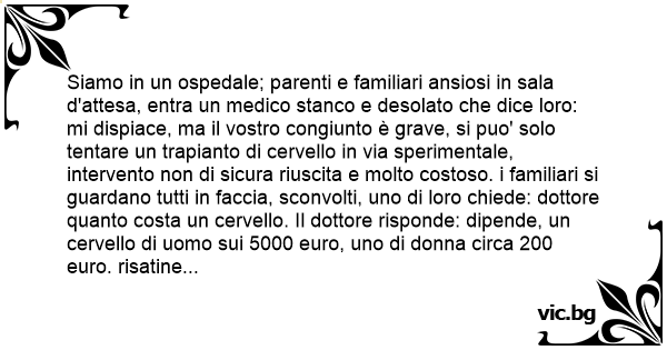 Siamo in un ospedale; parenti e familiari ansiosi in sala d'attesa, entra un medico stanco e desolato che dice loro: mi dispiace, ma il vostro congiunto è grave, si puo' solo tentare un trapianto di cervello in via sperimentale, intervento non di sicura riuscita e molto costoso. i familiari si guardano tutti in faccia, sconvolti, uno di loro chiede: dottore quanto costa un cervello. Il dottore risponde: dipende, un cervello di uomo sui 5000 euro, uno di donna circa 200 euro. risatine soffocate da parte degli uomini presenti in sala; un parente domanda: ma a cosa è dovuta questa differenza di prezzo?