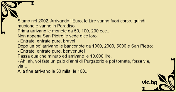 Siamo nel 2002. Arrivando l’Euro, le Lire vanno fuori corso, quindi muoiono e vanno in Paradiso.