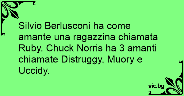 Silvio Berlusconi ha come amante una ragazzina chiamata Ruby. Chuck Norris ha 3 amanti chiamate Distruggy, Muory e Uccidy.