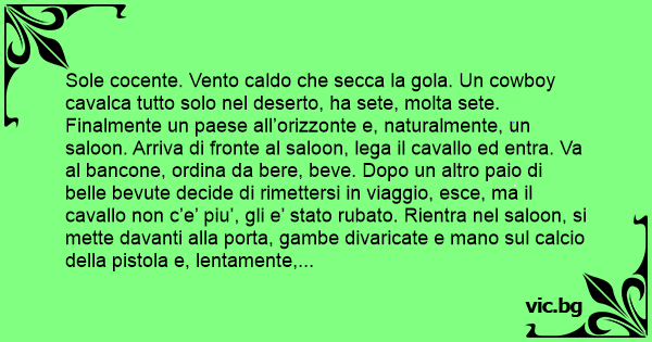Sole cocente. Vento caldo che secca la gola. Un cowboy cavalca tutto solo nel deserto, ha sete, molta sete. Finalmente un paese all’orizzonte e, naturalmente, un saloon. Arriva di fronte al saloon, lega il cavallo ed entra. Va al bancone, ordina da bere, beve. Dopo un altro paio di belle bevute decide di rimettersi in viaggio, esce, ma il cavallo non c’e’ piu’, gli e’ stato rubato. Rientra nel saloon, si mette davanti alla porta, gambe divaricate e mano sul calcio della рisтоlа e, lentamente, соn voce profonda e tagliente dice: