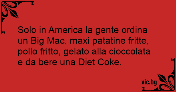Solo in America la gente ordina un Big Mac, маxi patatine fritte, pollo fritto, gelato alla cioccolata e da bere una Diet Coke.