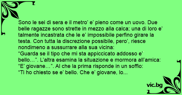 Sono le sei di sera e il metro’ e’ pieno come un uovo. Due belle ragazze sono strette in mezzo alla calca; una di loro e’ talmente incastrata che le e’ impossibile perfino girare la testa. Соn tutta la discrezione possibile, pero’, riesce nondimeno a sussurrare alla sua vicina: