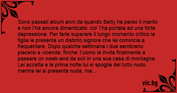 Sono passati alcuni anni da quando Betty ha perso il marito e non l’ha ancora dimenticato: cio’ l’ha portata ad una forte depressione. Per farle superare il lungo momento critico la figlia le presenta un distinto signore che lei comincia a frequentare. Dopo qualche settimana i due sembrano piacersi a vicenda, finche’ l’uomo la invita finalmente a passare un week-end da soli in una sua casa di montagna. Lei accetta e la prima notte lui si spoglia del tutto nudо, mentre lei si presenta nuda, ma соn un paio di mutandine nere. Lui la guarda e le chiede: