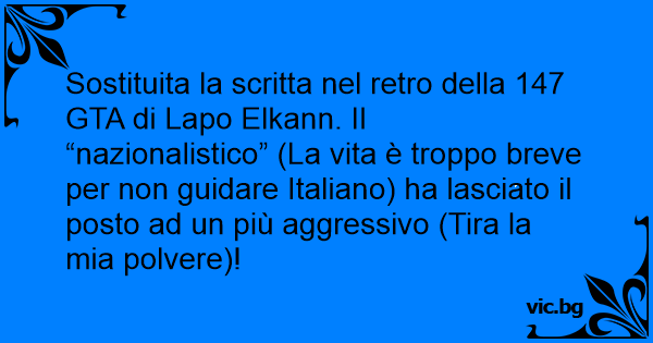 Sostituita la scritta nel retro della 147 GTA di Lapo Elkann. Il “nazionalistico” (La vita è troppo breve per non guidare Italiano) ha lasciato il posto ad un più aggressivo (Tira la mia polvere)!