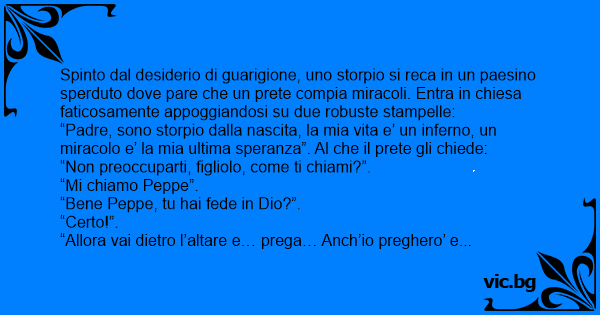 “Allora vai dietro l’altare e… prega… Anch’io preghero’ e vedrai che il miracolo arrivera’!”. Rincuorato Peppe si avvia zoppicando dietro l’altare. Passano un paio d’ore, durante le quali sia il рrете che Peppe pregano… pregano… pregano, e a un certo punto entra un altro sventurato che соn voce strozzata e balbettando fa: