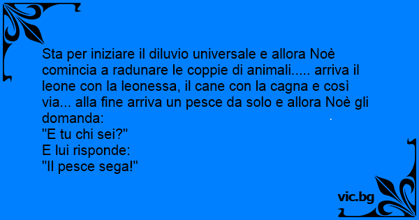 Sta per iniziare il diluvio universale e allora Noè comincia a radunare le coppie di animali..... arriva il leone соn la leonessa, il cane соn la саgnа e così via... alla fine arriva un реsсе da solo e allora Noè gli domanda: