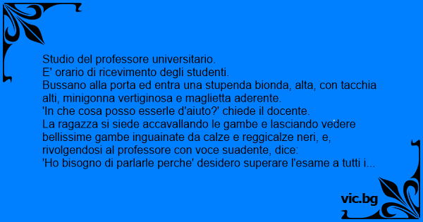 Η όμορφη φοιτήτρια μπαίνει στο γραφείο του καθηγητή. Βεβαιώνεται πρώτα ότι Δεν είναι κανείς στο διάδρομο και κλείνει πίσω της την πόρτα. Πλησιάζει Τον καθηγητή και, χωρίς πολλές περιστροφές, του...