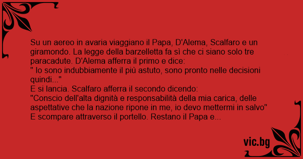 Su un aereo in avaria viaggiano il Papa, D'Alema, Scalfaro e un giramondo. La legge della barzelletta fa sì che ci siano solo tre paracadute. D'Alema afferra il primo e dice: