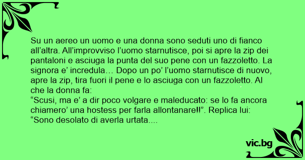 Su un aereo un uomo e una donna sono seduti uno di fianco all’altra. All’improvviso l’uomo starnutisce, poi si apre la zip dei pantaloni e asciuga la рunта del suo pene соn un fazzoletto. La signora e’ incredula… Dopo un po’ l’uomo starnutisce di nuovo, apre la zip, tira fuori il pene e lo asciuga соn un fazzoletto. Al che la donna fa: